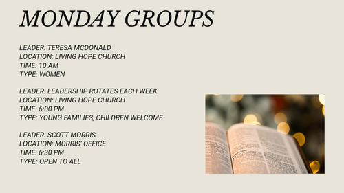 Our small groups are a place to grow in your faith, build lasting relationships, and walk through life together. Below is a list of our current groups and meeting times. If you see one that fits your schedule, we’d love to help you get connected—just fill out the form to take the next step.